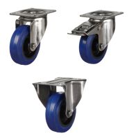 Stainless Steel 200mm Blue Non Marking Elastic Rubber 4 Bolt Plate Fitting Non-Marking Blue Elastic Rubber Stainless Steel Castors (40Kg to 800Kg)